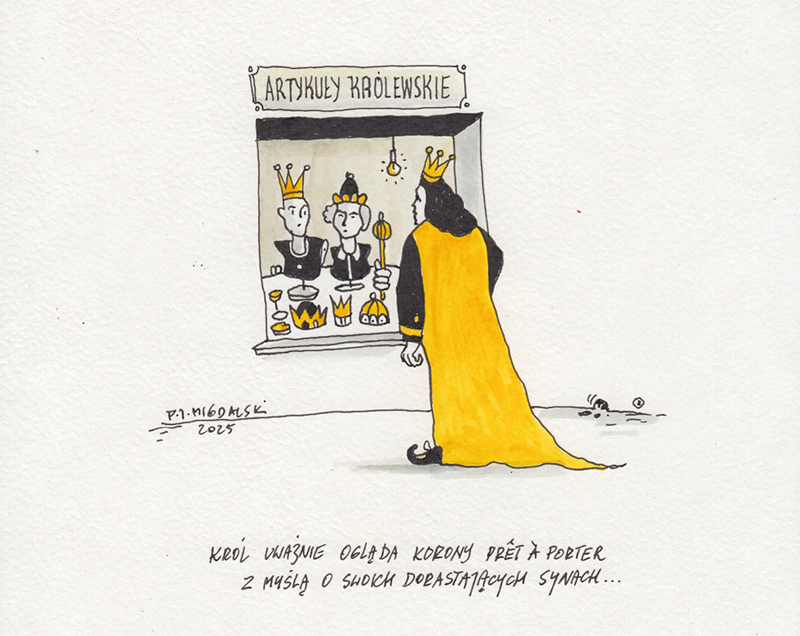 Król uważnie ogląda korony pret a porter, z myślą o swoich synach