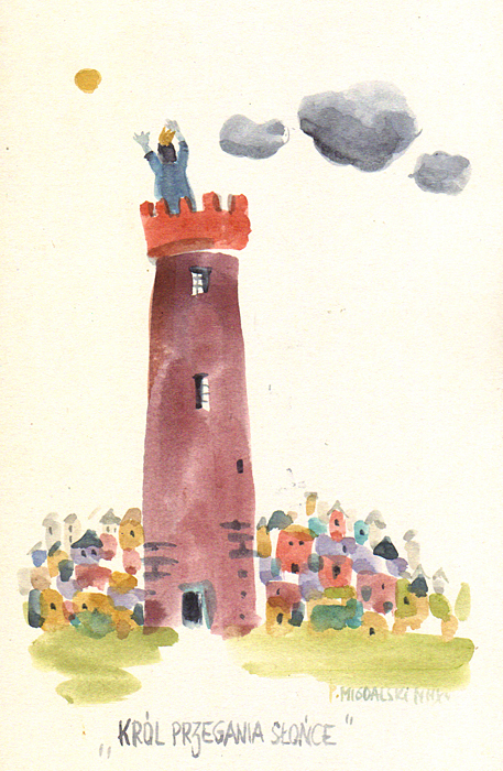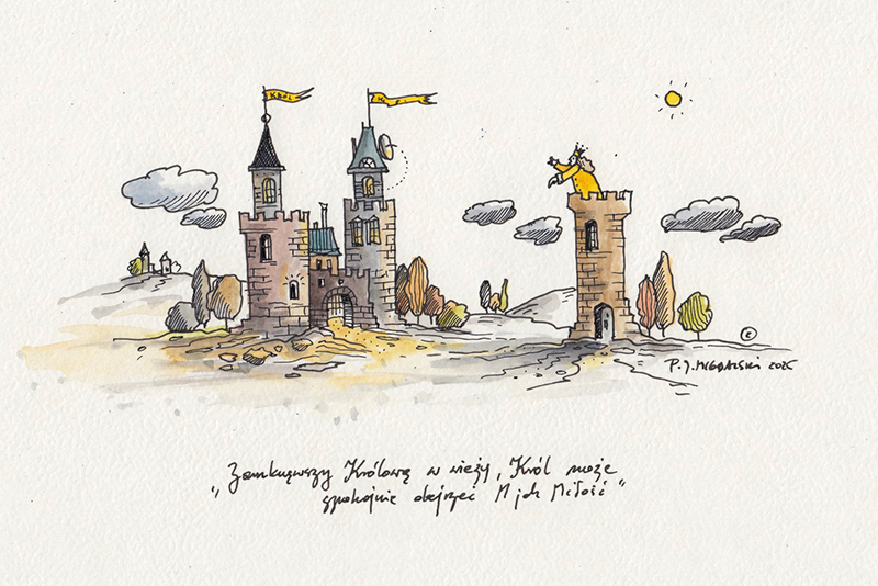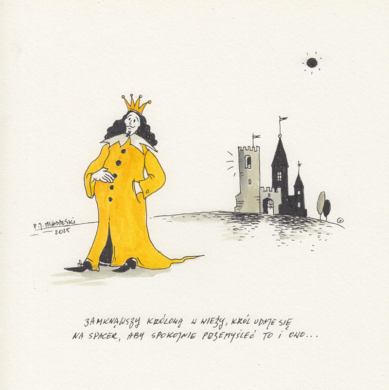 Zamknąwszy Królową w wieży, Król udaje się na spacer, aby spokojnie przemyśleć to i owo